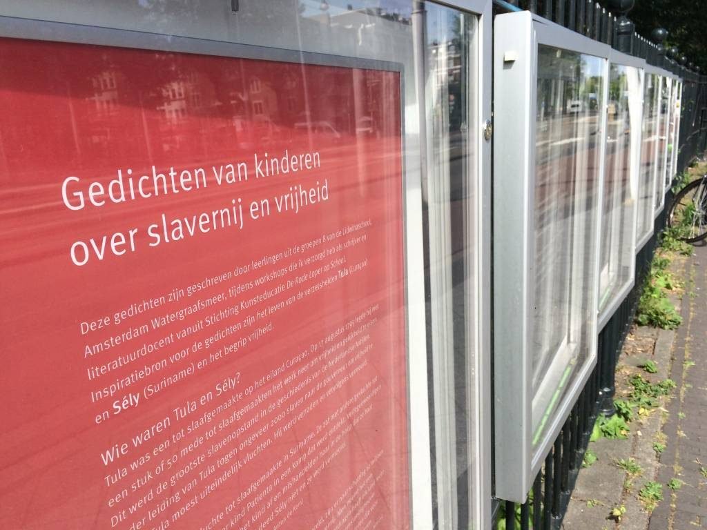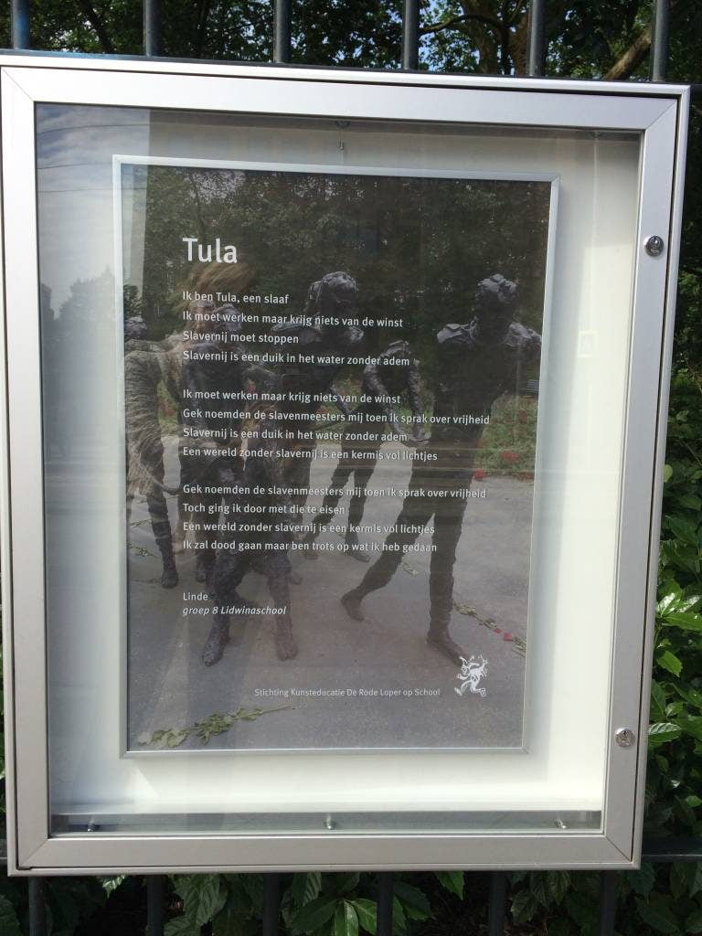 Aan het hek bij het Oosterpark, dichtbij de taxi’s, hangt in juli en augustus 2017 een expositie van gedichten geschreven door leerlingen uit de groep 8A van de Lidwinaschool, Amsterdam Watergraafsmeer. Dit gebeurde in het kader van de workshops die schrijfster en literatuurdocente Henna Goudzand Nahar verzorgd heeft vanuit Stichting De rode loper op school, zie Workshops-Gedichten. De leerlingen zijn voor deze gedichten geïnspireerd door het leven van de Curaçaosche verzetsheld Tula, de Surinaamse verzetsheldin Sély en kindslavernij.